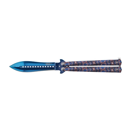 Nóż motylkowy o solidnej metalowej konstrukcji oraz efektownym niebieskim wykończeniu typu damast.