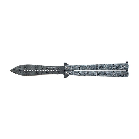Nóż motylkowy o solidnej metalowej konstrukcji oraz efektownym czarno-szarym wykończeniu typu damast.