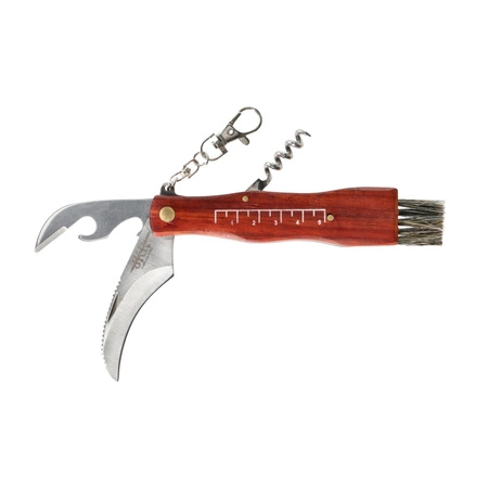 Fabrycznie nowy, wysokiej jakości nóż hiszpańskiej marki JOKER znanej na całym świecie ze swoich doskonałych wyrobów. Jest to składany nóż przeznaczony do zbierania grzybów. Specjalnie zakrzywione ostrze typu Warncliff (ułatwia przycinanie grzybów) wykonane jest z mocnej stali nierdzewnej. Rękojeść wykonana jest z wytrzymałego drewna, na którym znajduje się miarka umożliwiająca zwymiarowanie średnicy grzyba. Na końcu rękojeści znajduje się miotełka umożliwiająca czyszczenie grzybów. Dzięki dołączonemu karabińczykowi można przypiąć go np. do paska. Dodatkowo model ten wyposażony jest w otwieracz do puszek i butelek, pensetę oraz korkociąg. W komplecie pokrowiec z kodury z możliwością przypięcia do pasa. Całość zapakowana jest w ładne tekturowe pudełko co sprawia że nóż idealnie nadaje się na prezent.