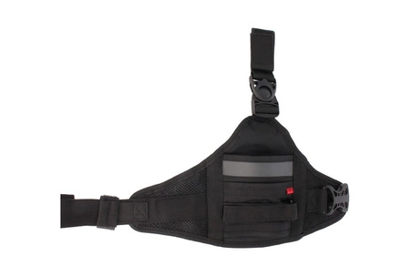 Montaż na udo - regulowana taśma z nylonu balistycznego łączona z elastyczną taśmą z gumy pozwala dopasować panel do obwodu uda. Całość zapinana klamrą wykonaną z polimeru.