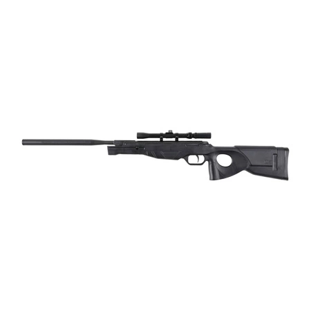 Wiatrówka sprężynowa w stylu karabinu snajperskiego, wyposażona w polimerową kolbę typu thumb-hole, celownik optyczny 3-7 × 32 oraz bruzdowaną lufę z atrapą tłumika.
